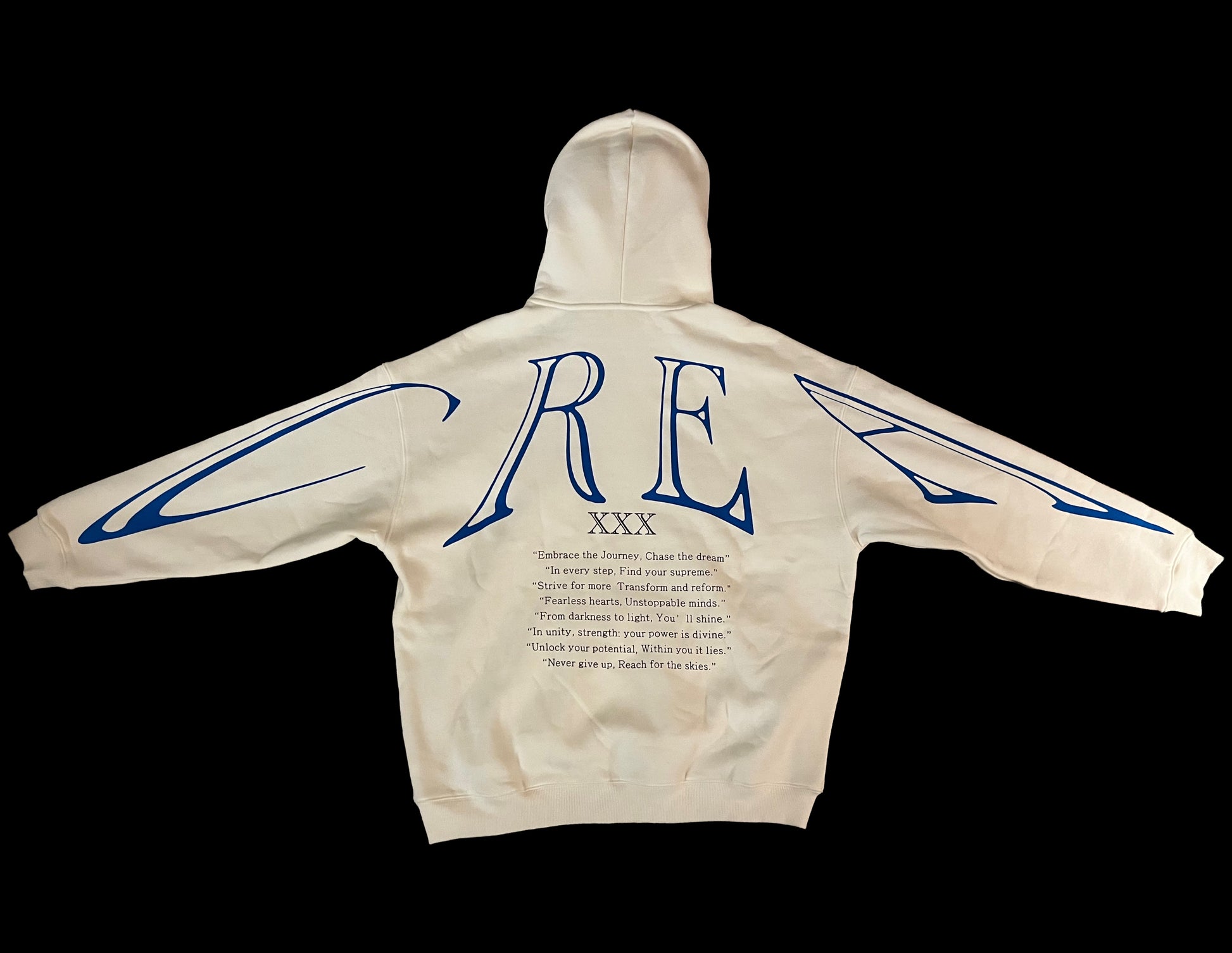 This is the white with blue text hoodie from CREA.