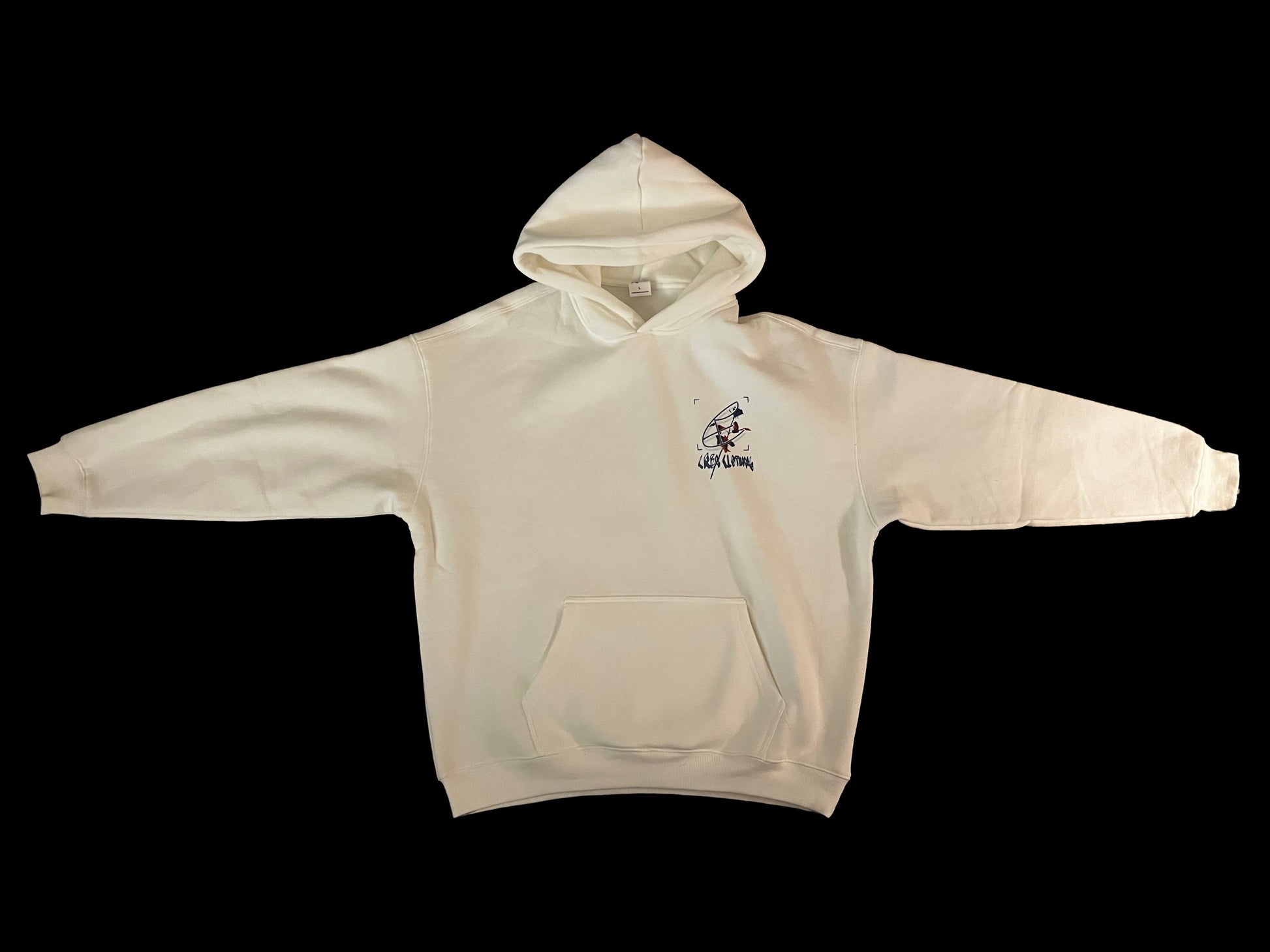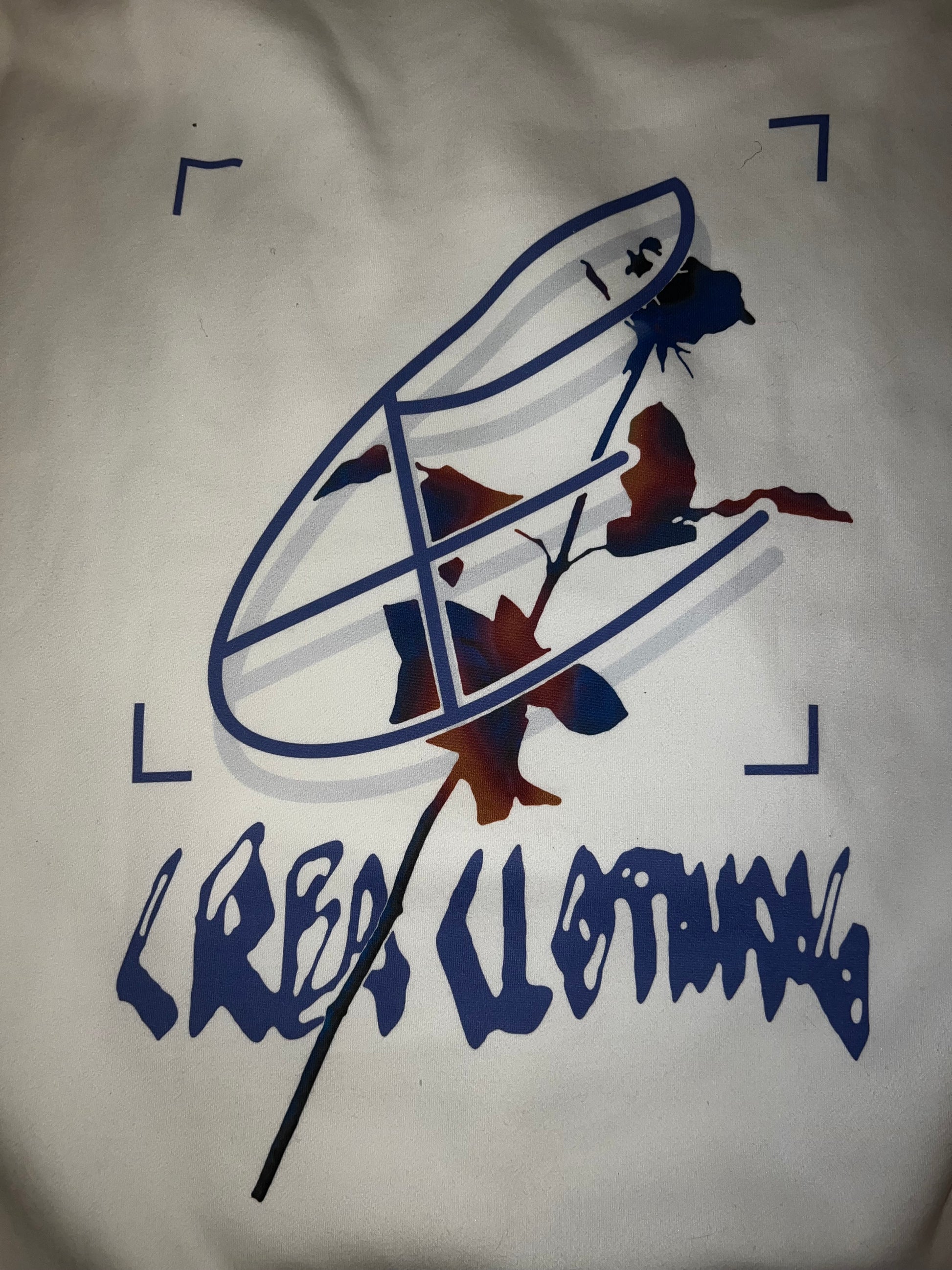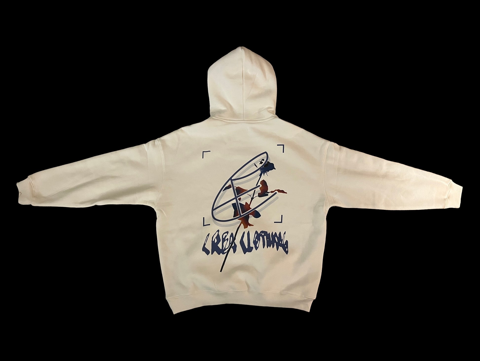Crafted from ultra-soft, heavyweight 100% cotton, the **CREA Blue Rosé** blends comfort with artistic expression. Designed in a clean off-white tone, this hoodie is elevated by a bold back graphic—featuring a unique fusion of nature-inspired silhouettes, abstract line art, and the signature CREA logo, all framed in a modern target design. The graffiti-style “CREA CLOTHING” lettering at the base adds a raw, street-art edge, reflecting the brand’s creative roots.