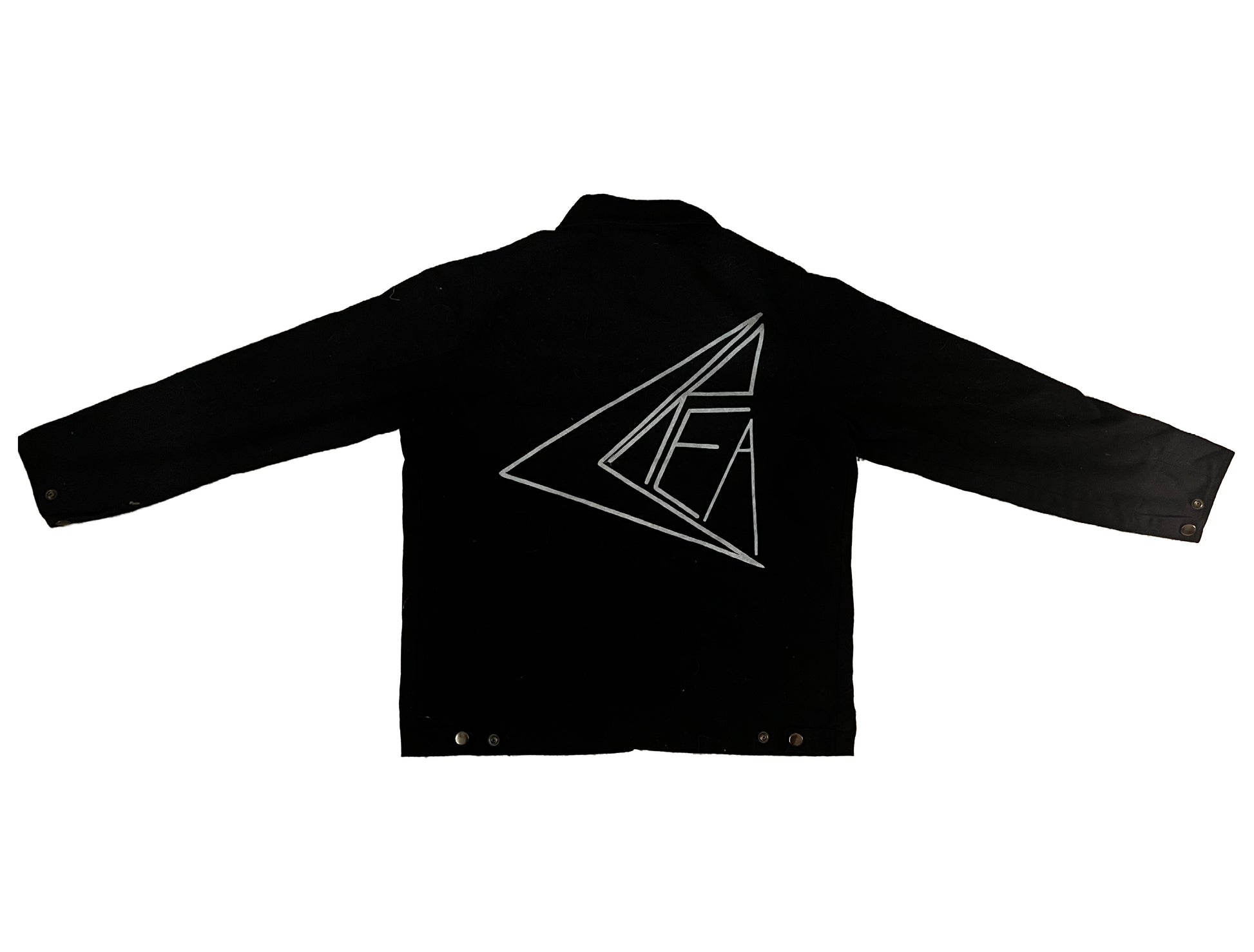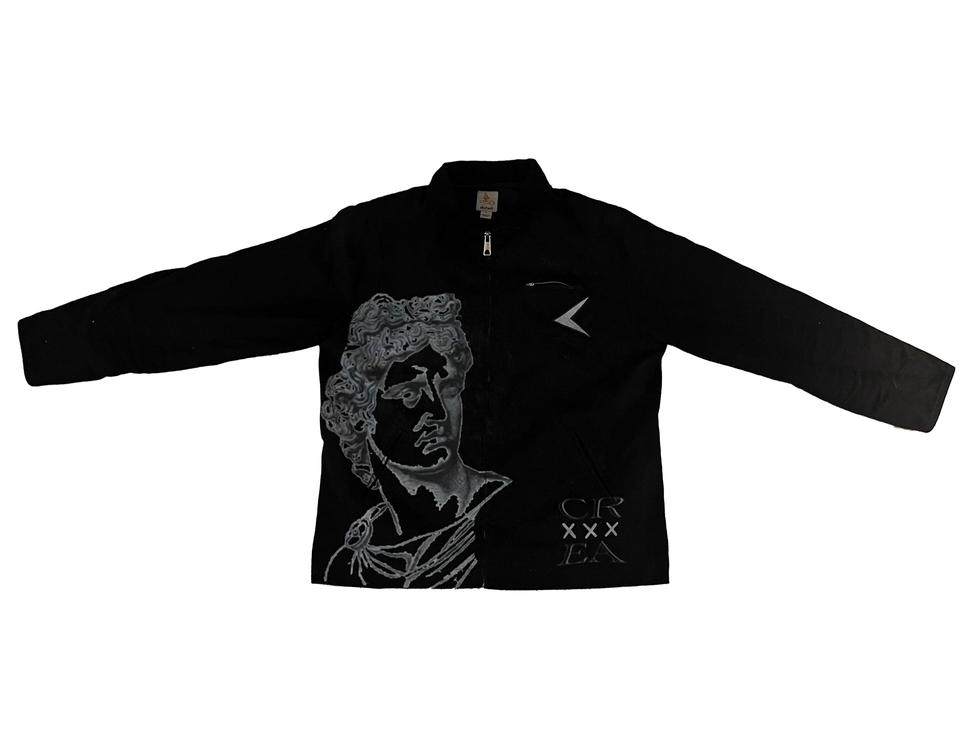 Crafted from 100% premium denim, the CREA jacket is a bold fusion of classical art and modern street style. This heavyweight black denim piece is designed to stand out, featuring a hand-painted graphic of a Greco-Roman statue on the front, symbolizing timeless strength and beauty. Subtle but sharp CREA branding details accent the chest and lower front, while the back showcases a geometric CREA logo design—representing precision and creativity.